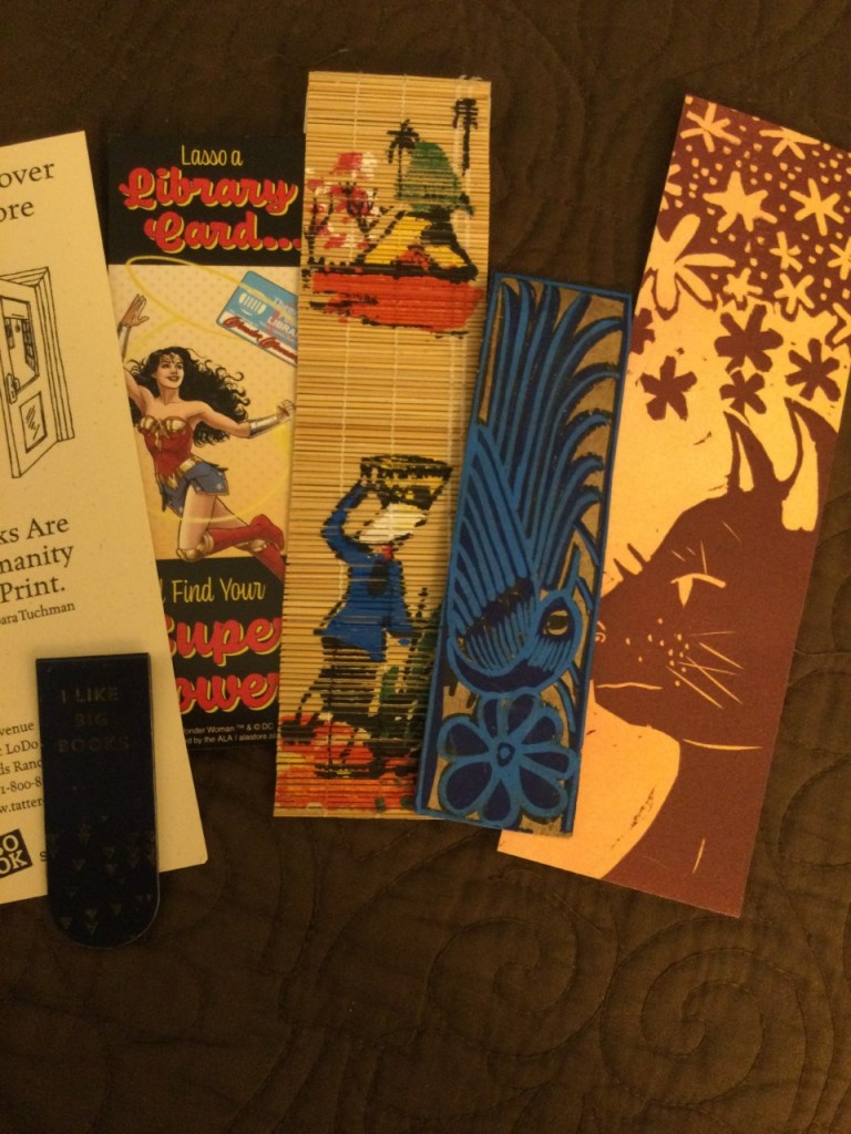 From left to right, one that says “The Dusty Cover Bookstore” (I just loved the name! Someone left it in a book donated to my Little Free Library; the dark rectangle in front of it is one of those cool magnetic ones, given to me by a friend in a card congratulating me on 50 years of membership in AAUW. To their right, a library giveaway bookmark of my childhood hero, Wonder Woman, then a bookmark from Viet Nam; the blue one painted on bark, a souvenir from Mexico brought back by a friend; and a special Literary Project by Jaq, a student who drew and print-made 25 of these for our whole class. her work is outstanding.