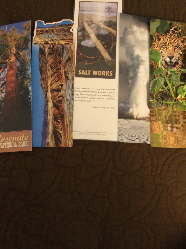 These are all bookmarks given to me. From left to right: from Yosemite National Park, from Oregon, from Utah, from Yosemite again, and a really attractive leopard from WWF (World Wildlife Fund, of which I am a member.)