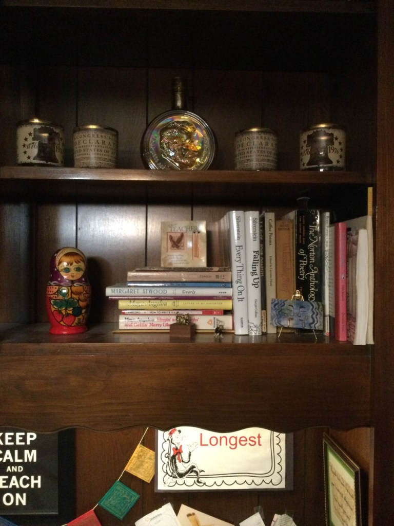 On the second shelf is a Bulgarian stacking doll (Does anyone know the correct term for these dolls?) a friend gave me after her trip to Europe, a “Teacher” appreciation card with two hand-dipped candles attached from one of my favorite former students (She came through in 2009.) It is perched atop various collections of poetry by poets like Maya Angelou, a signed Margaret Atwood (a gift from a friend), a book on writing haiku, and other smaller poetry books. To the right are the larger books: Shel Silverstein, Emily Dickinson, T.S. Eliot, and a couple of others. Standing upright at the far right, poetry anthologies from college courses and some anthologies too tall to stand up on the shelf. In the foreground are, a bronze cat, which was a gift from my mother; a blown glass cat, a gift from a friend who went to Peru, and the business card of an artist, former student Jacq.