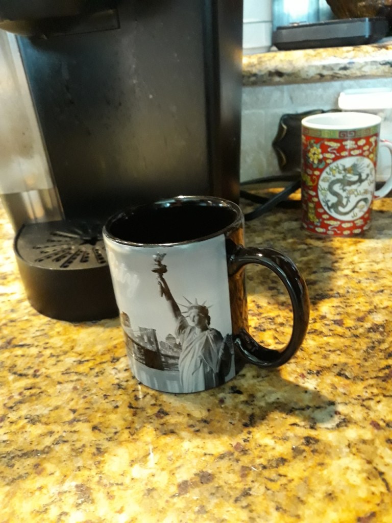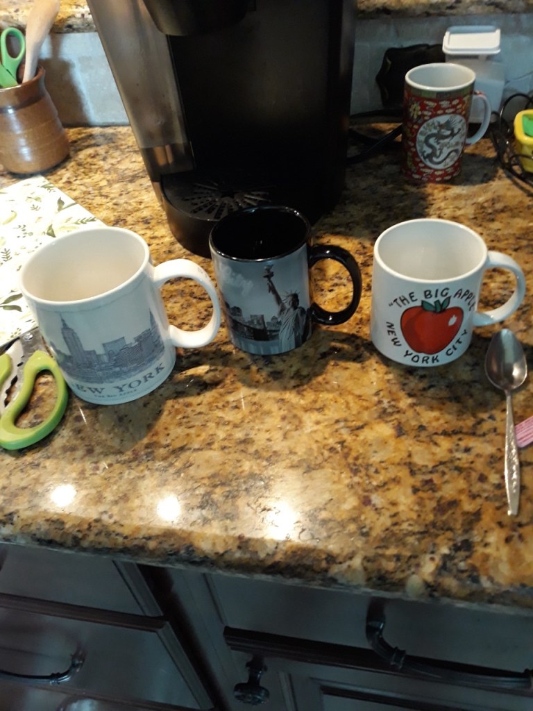 I started my virtual trip to NYC with a photo of my two New York mugs. I bought another at Goodwill yesterday, one I would have bought had I visited the Statue of Liberty in person.